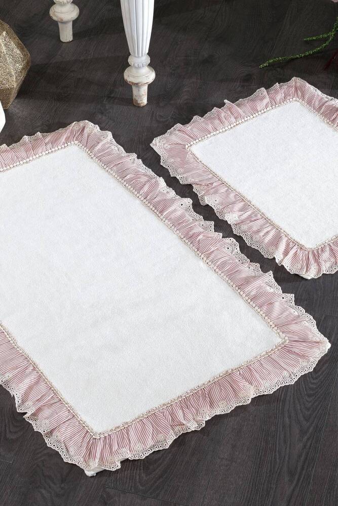 %100 Pamuk Kitty Çizgi Kumaşlı ve Dantelli 2'li Paspas Set - Pembe