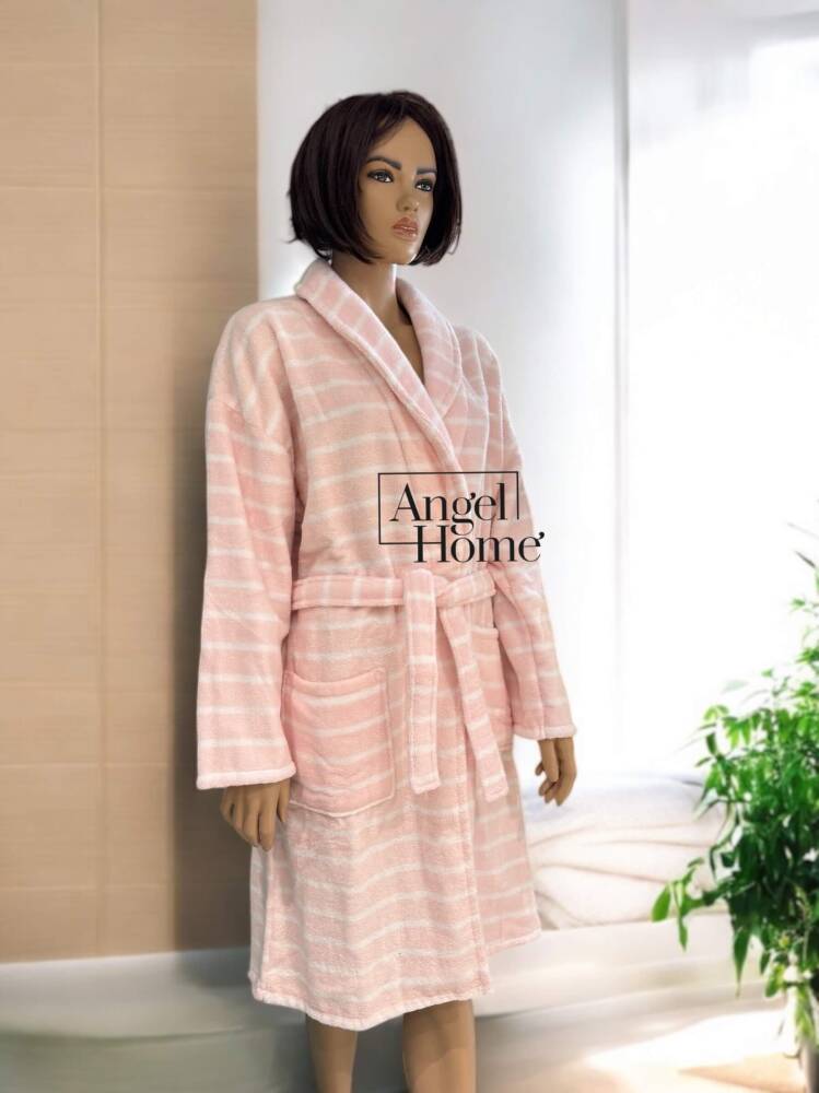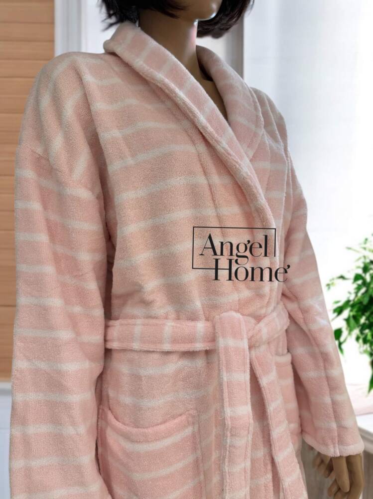 Banyo keyfinizi şıklık ve konforla buluşturun! Beyaz çizgili pudra kadın bornoz, %100 pamuk dokusu ile cildinize nazik bir dokunuş sunarken yüksek emiciliği sayesinde hızla kurur. Yumuşak ve hafif yapısı sayesinde hem rahatlık hem de şıklık sağlar. Dayanıklı ve nefes alabilen kumaşı ile uzun ömürlü kullanım sunan bu bornoz, banyodan sonra ya da spa ve hamam gibi özel anlarınızda mükemmel bir seçimdir.
