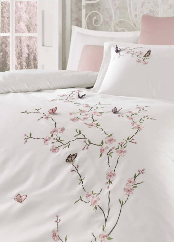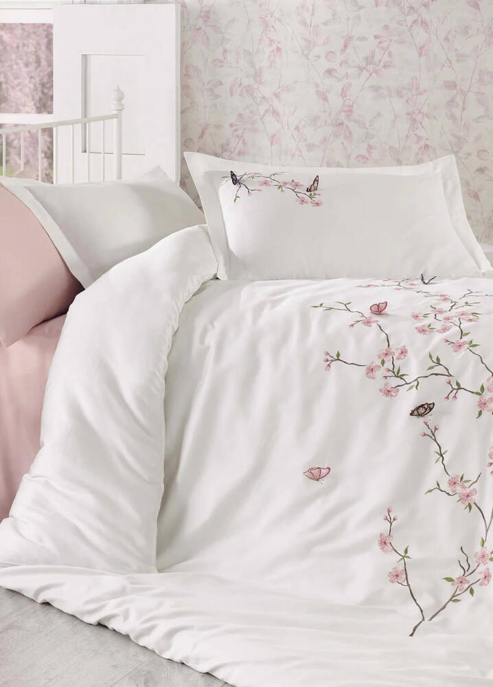 Butterfly %100 Pamuk Saten 3D Nakışlı Çift Kişilik Nevresim Takımı - Beyaz-Pembe