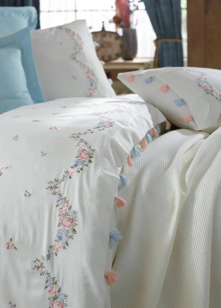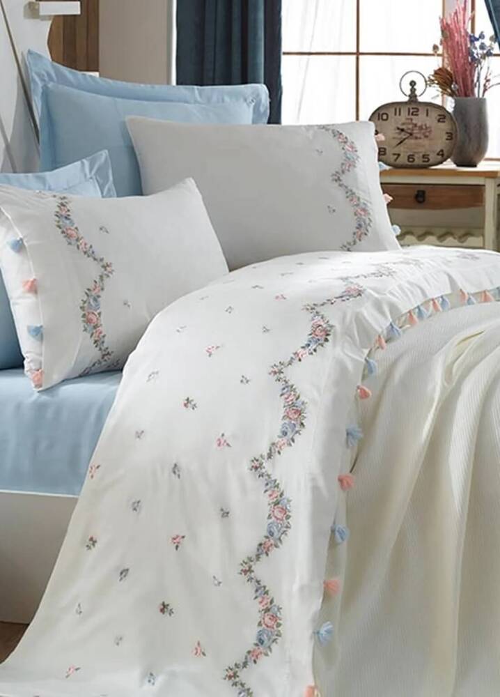 Yatak odanıza şıklık ve zarafet katacak %100 pamuk saten ince nakış detaylı pike takımı, yumuşacık dokusuyla konforlu bir uyku deneyimi sunar. 1. sınıf iplik kalitesi sayesinde uzun ömürlü ve dolgun yapısıyla formunu korur, sertleşme yapmaz.