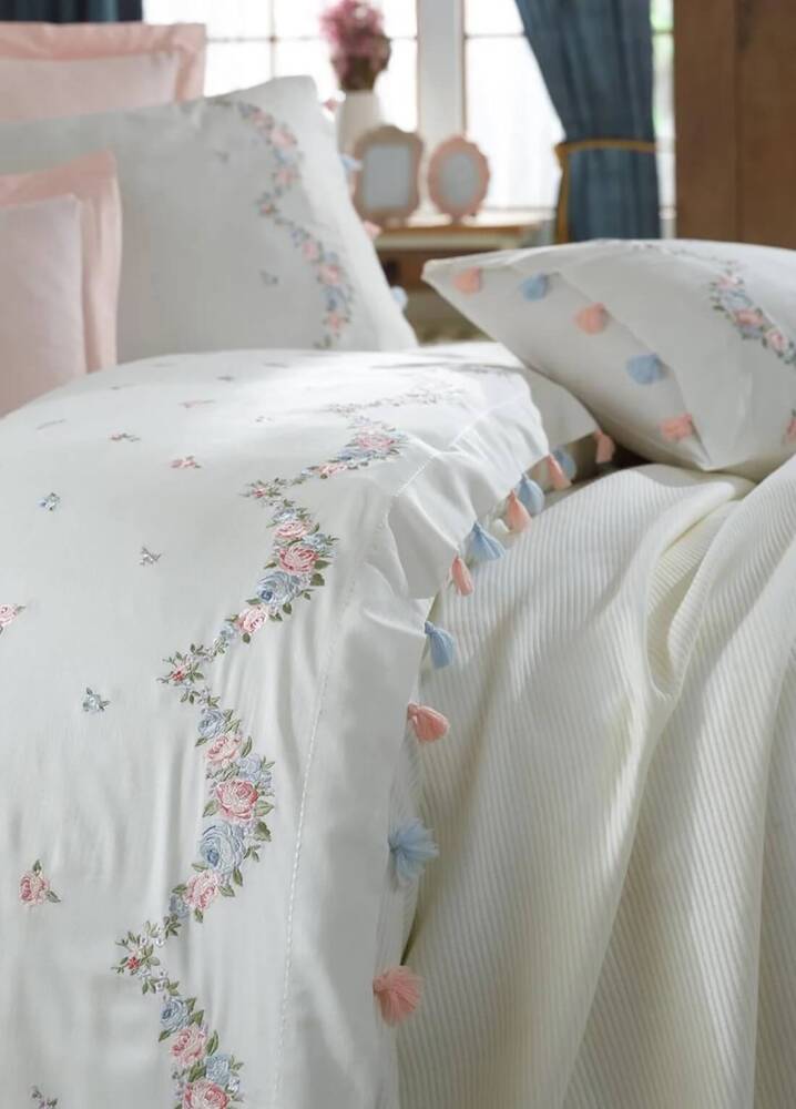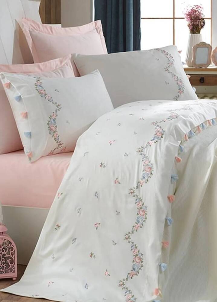 Yatak odanıza şıklık ve zarafet katacak %100 pamuk saten ince nakış detaylı pike takımı, yumuşacık dokusuyla konforlu bir uyku deneyimi sunar. 1. sınıf iplik kalitesi sayesinde uzun ömürlü ve dolgun yapısıyla formunu korur, sertleşme yapmaz.