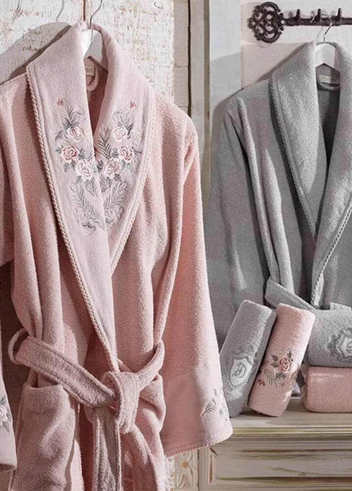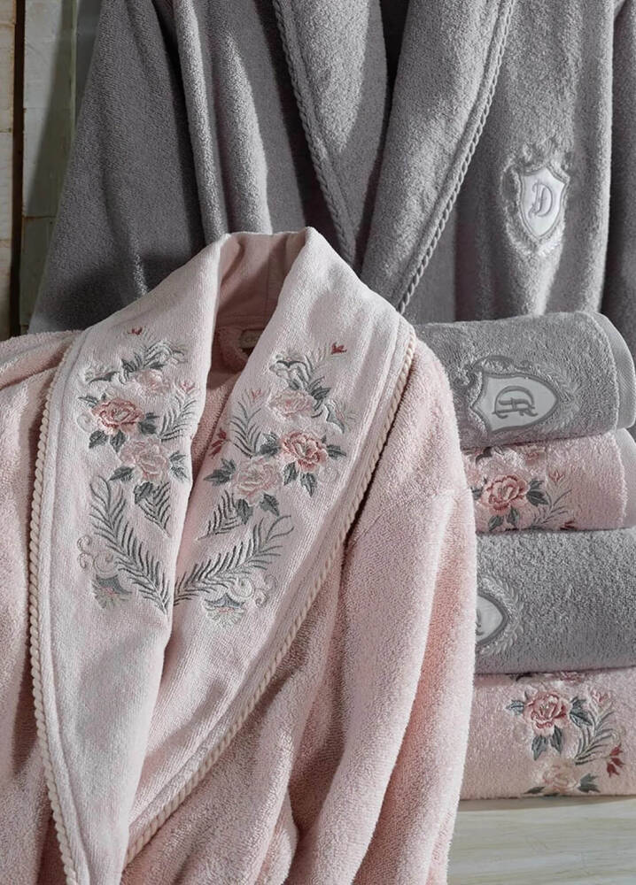Larosa 6 Parça %100 Pamuk Nakışlı Bornoz Seti - Pudra/Gri