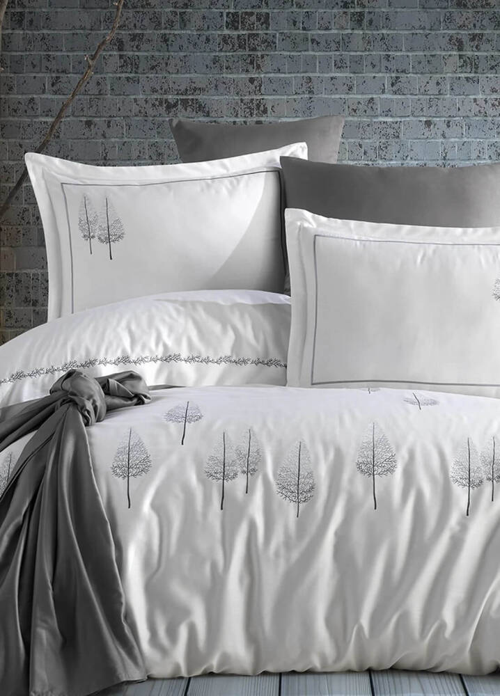 Pamira %100 Pamuk Saten Nakışlı Çift Kişilik Nevresim Takımı - Beyaz-Antrasit