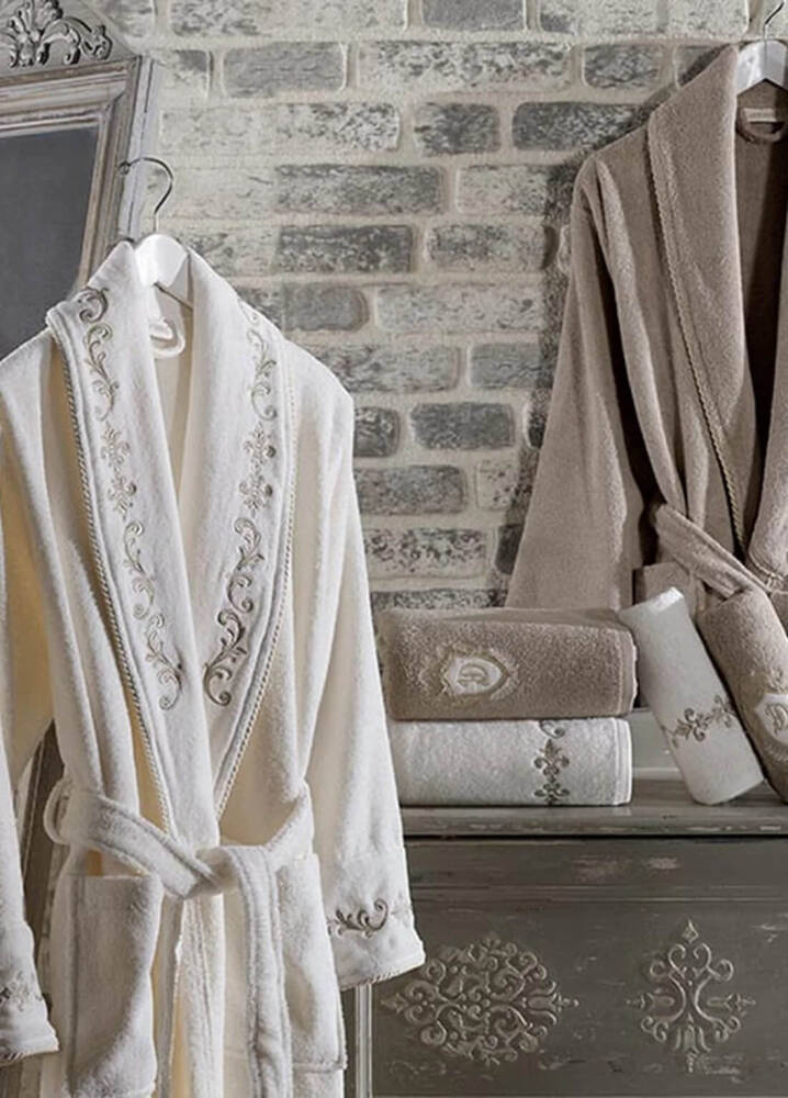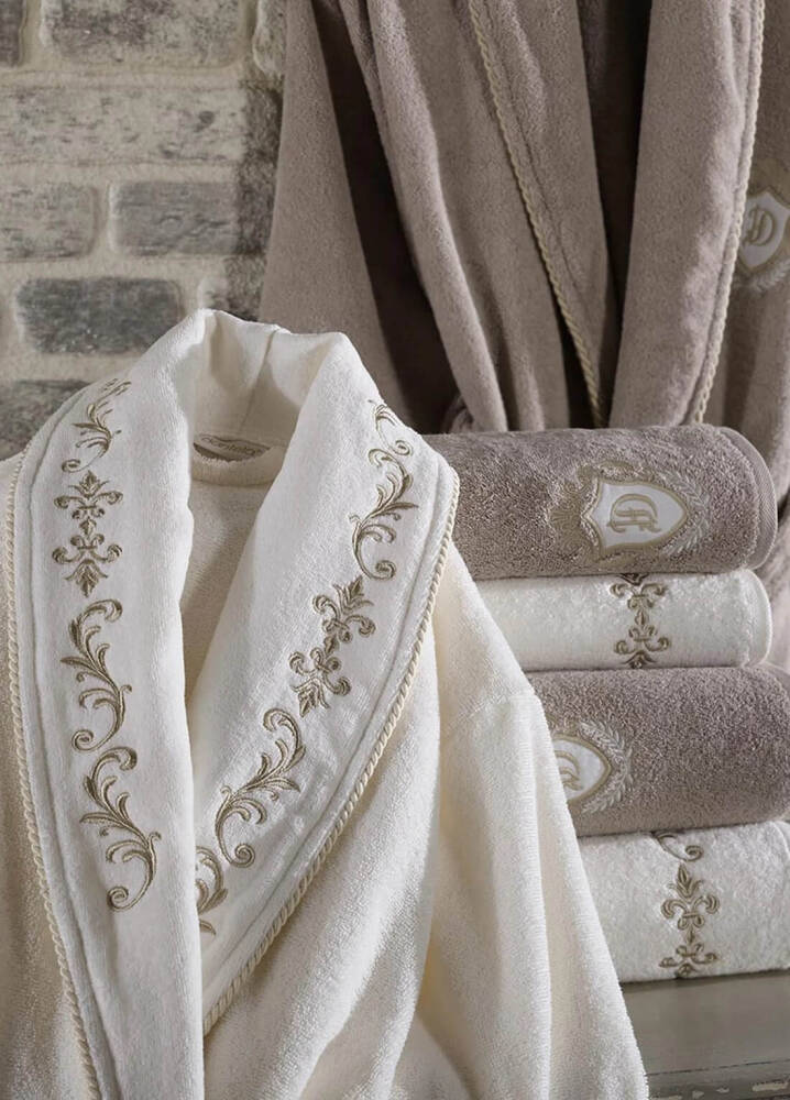 Sultan 6 Parça %100 Pamuk Nakışlı Bornoz Seti - Krem/Bej