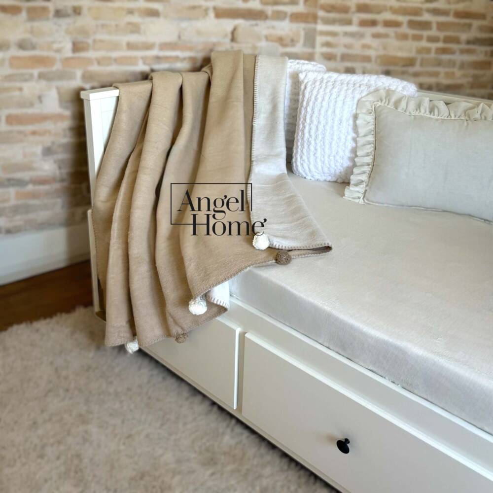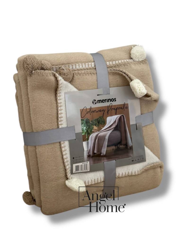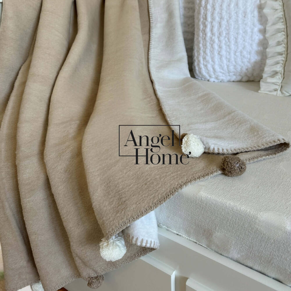 Tek Kişilik Merinos Ponponlu Battaniye – Çift Taraflı, 150x200 cm (Vizon-Krem)