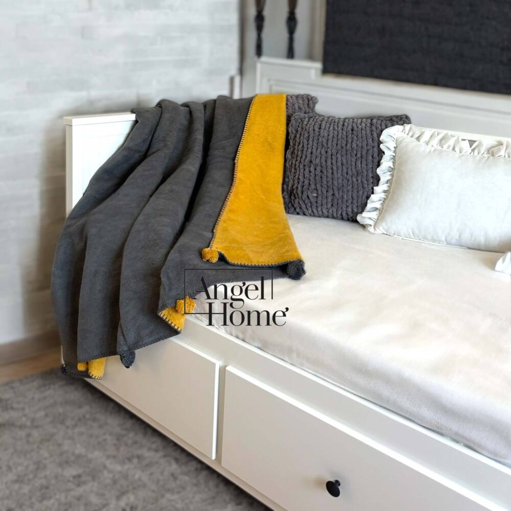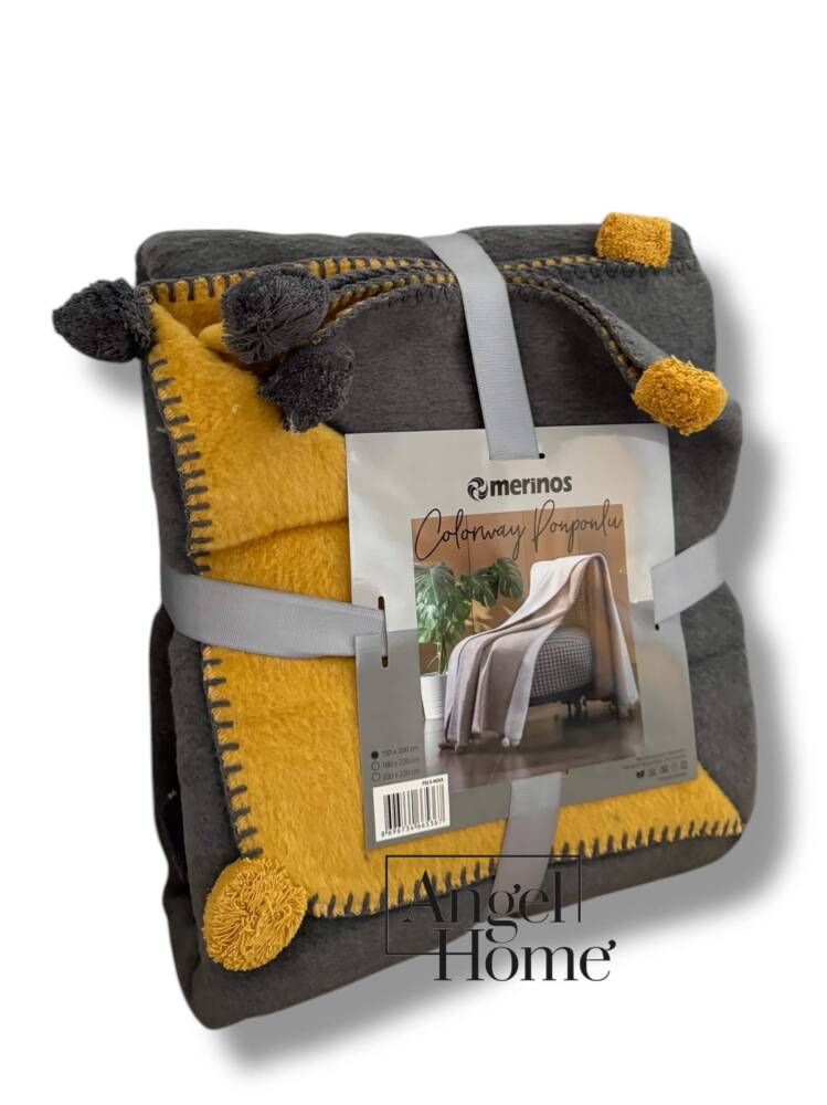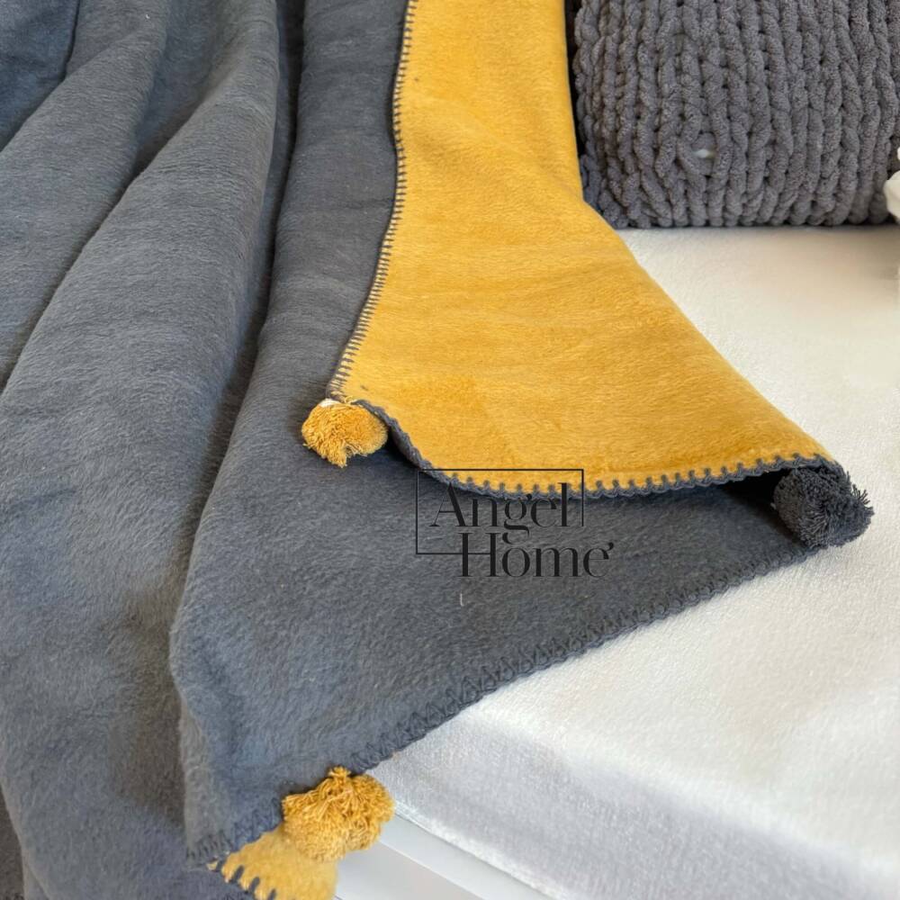Tek Kişilik Merinos Ponponlu Battaniye – Çift Taraflı, 150x200 cm (Antrasit - Hardal)