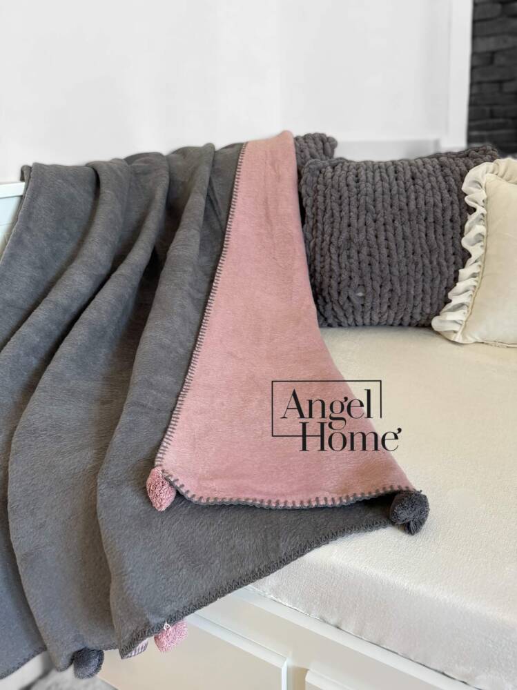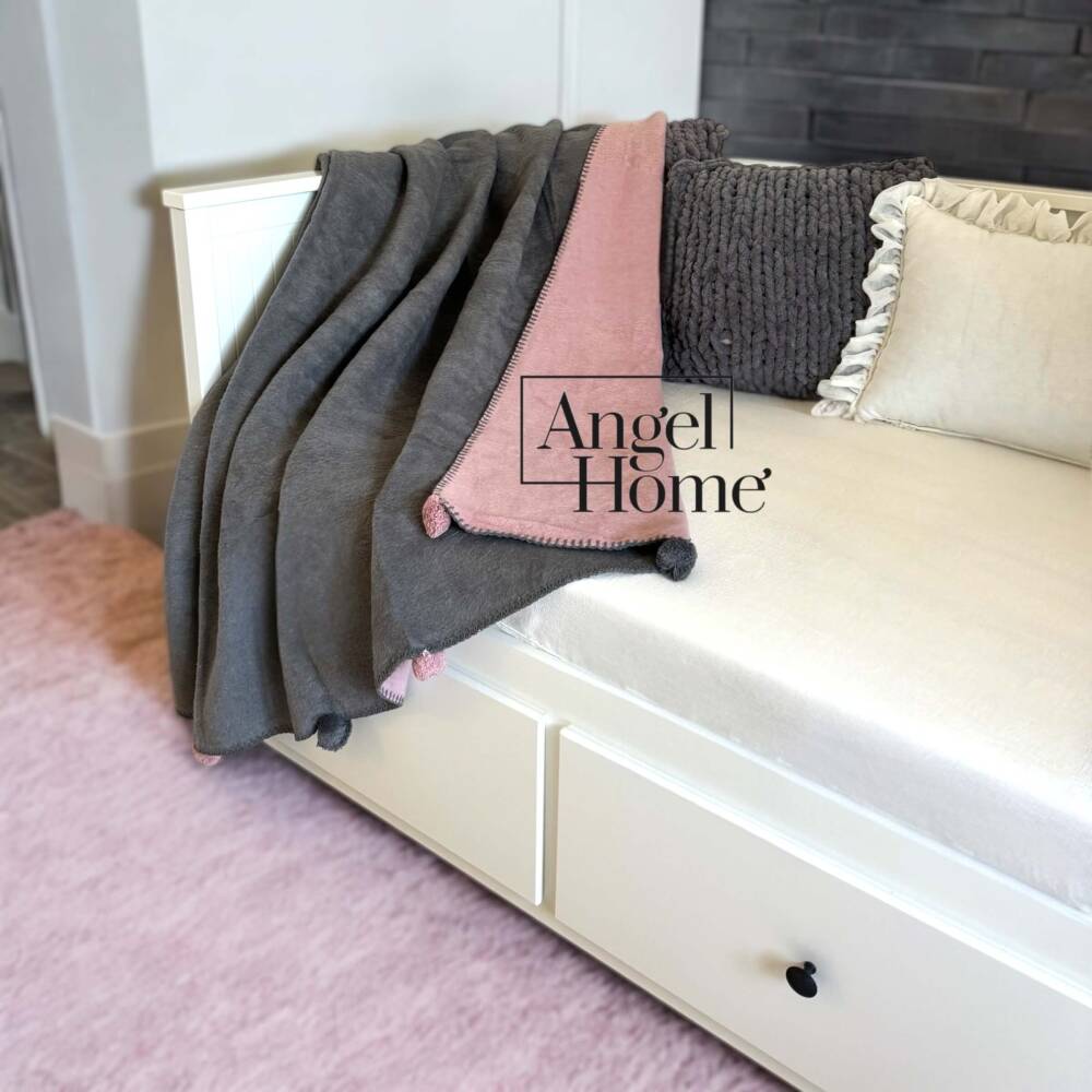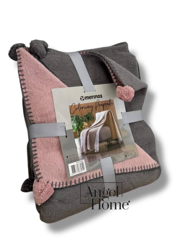 Tek Kişilik Merinos Ponponlu Battaniye – Çift Taraflı, 150x200 cm (Antrasit - Pembe)