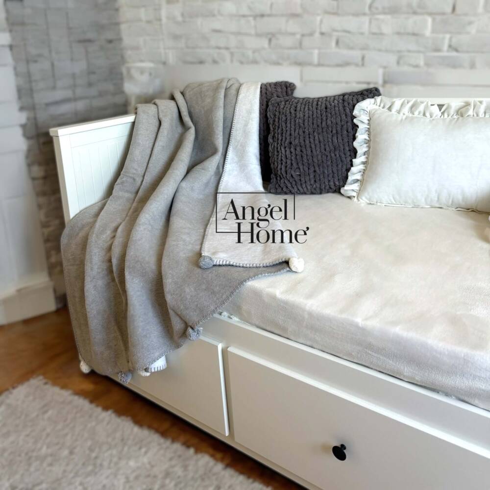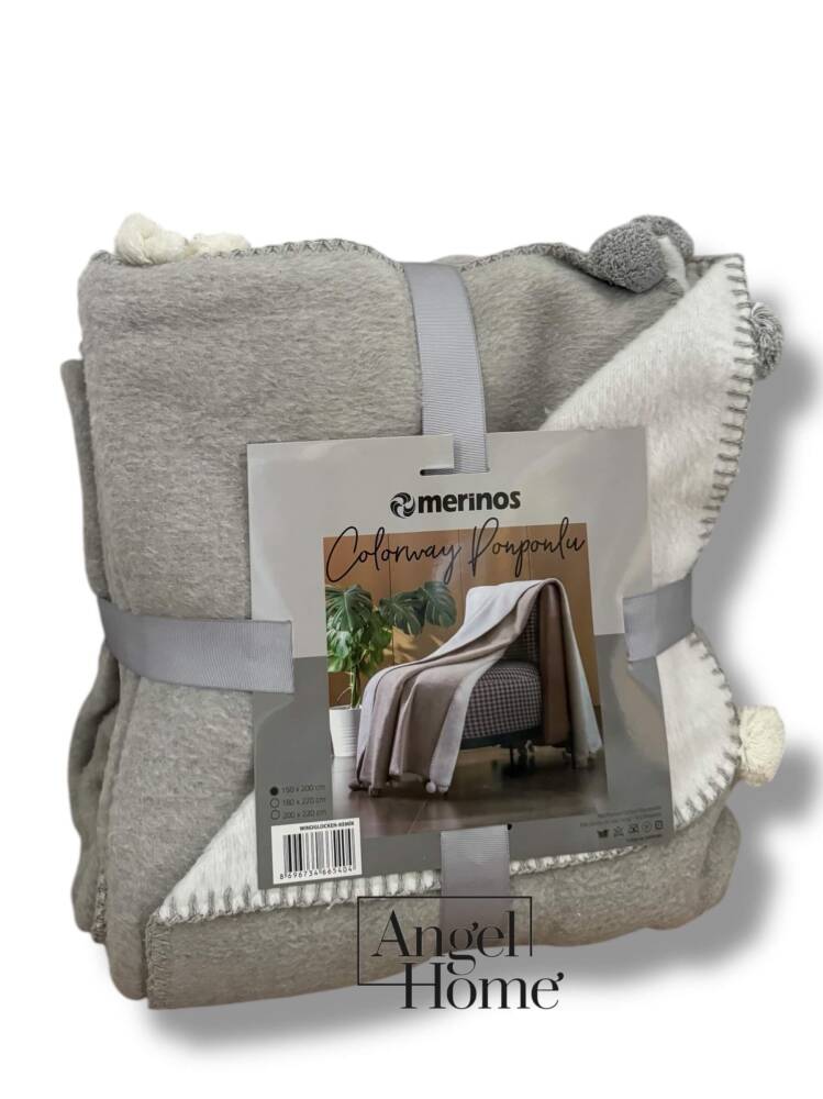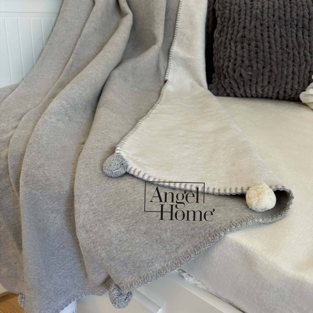 Tek Kişilik Merinos Ponponlu Battaniye – Çift Taraflı, 150x200 cm (Gri-Krem)