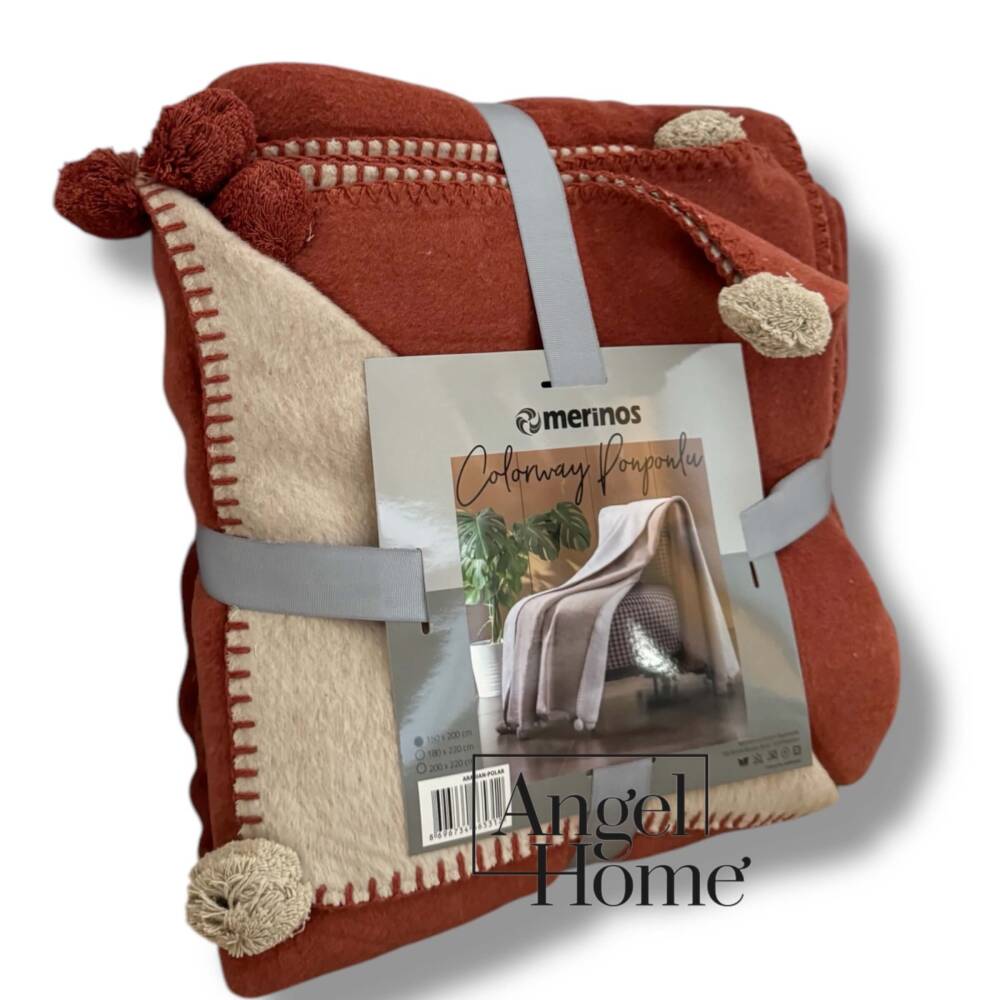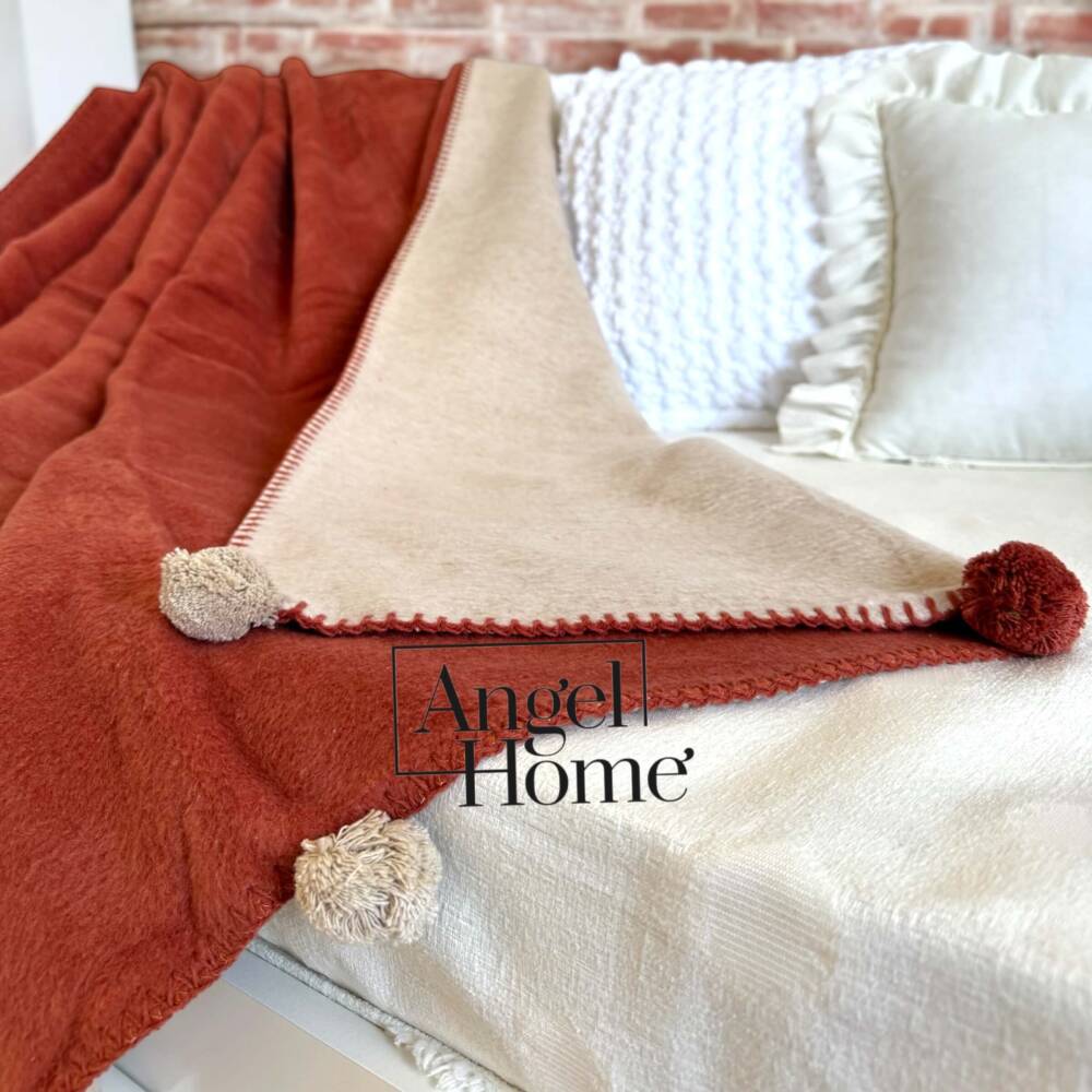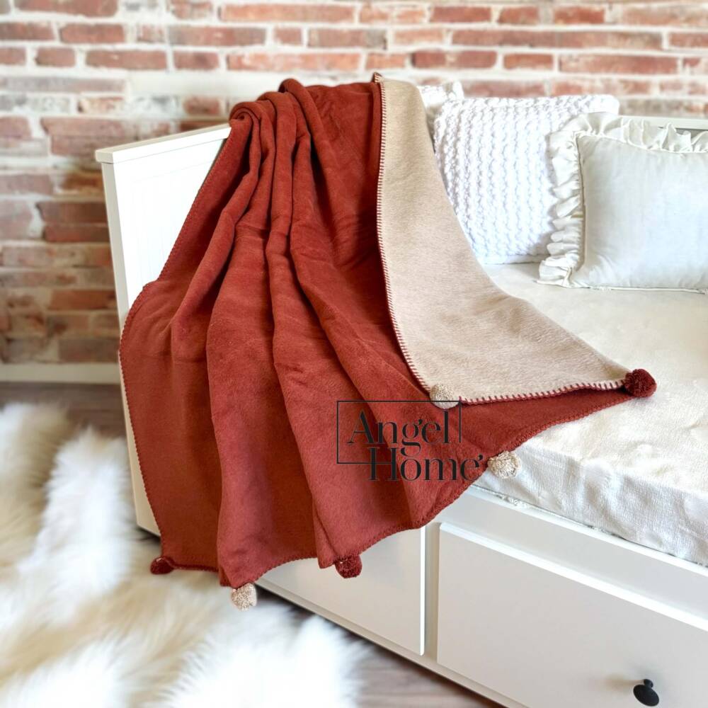 Tek Kişilik Merinos Ponponlu Battaniye – Çift Taraflı, 150x200 cm (Kiremit-Bej)