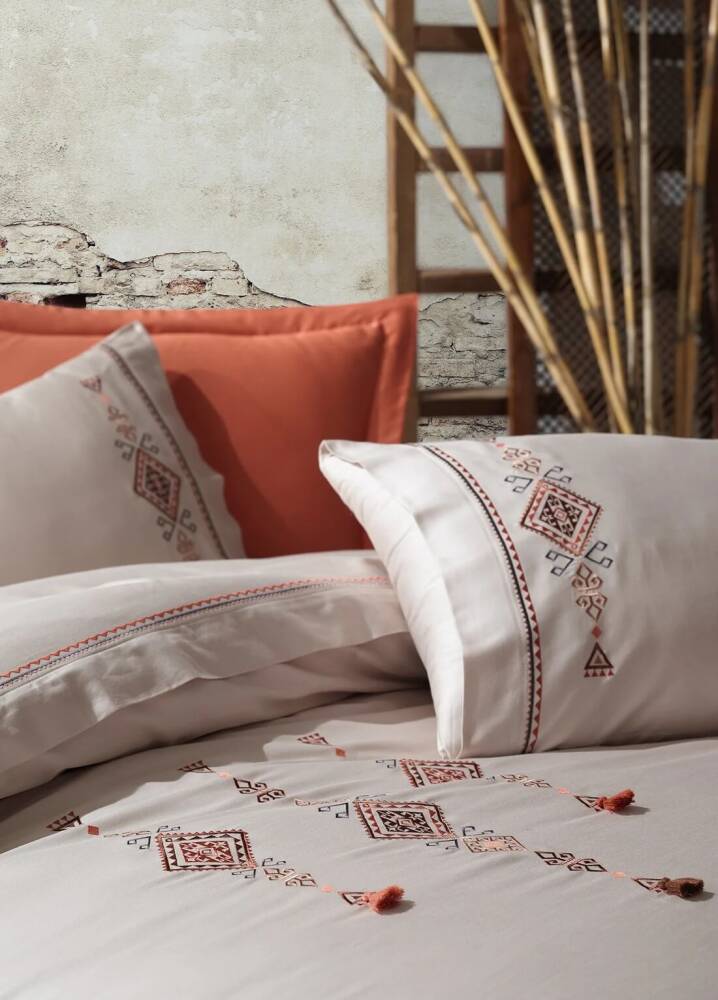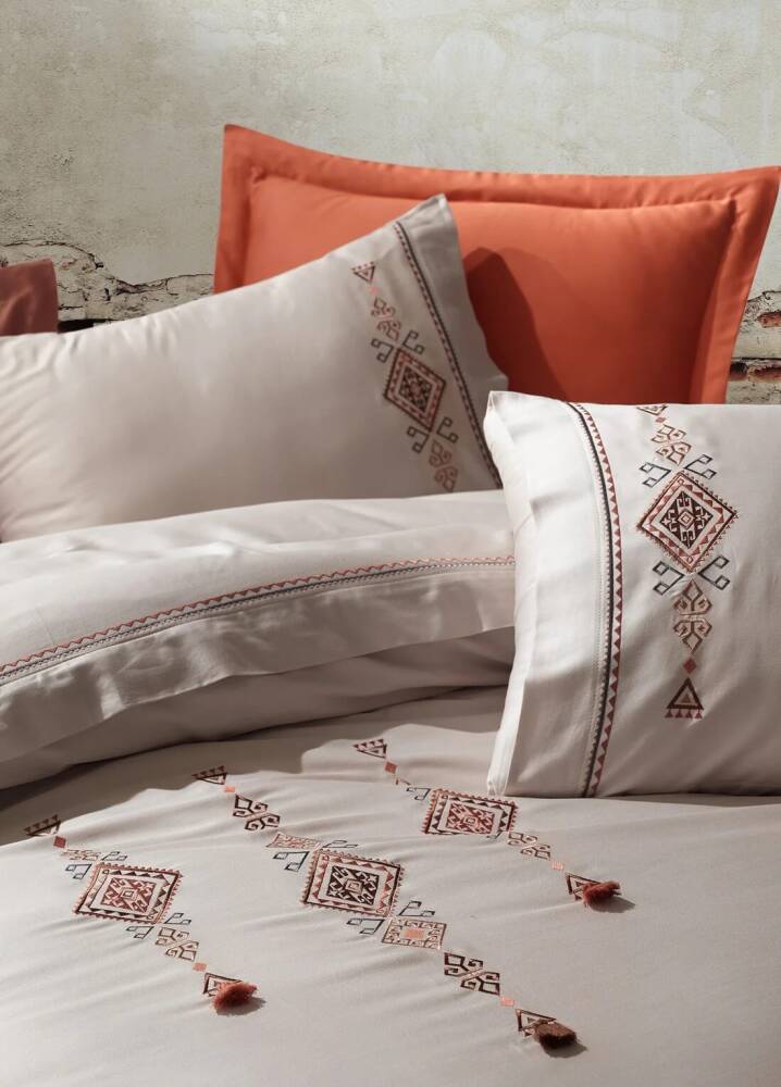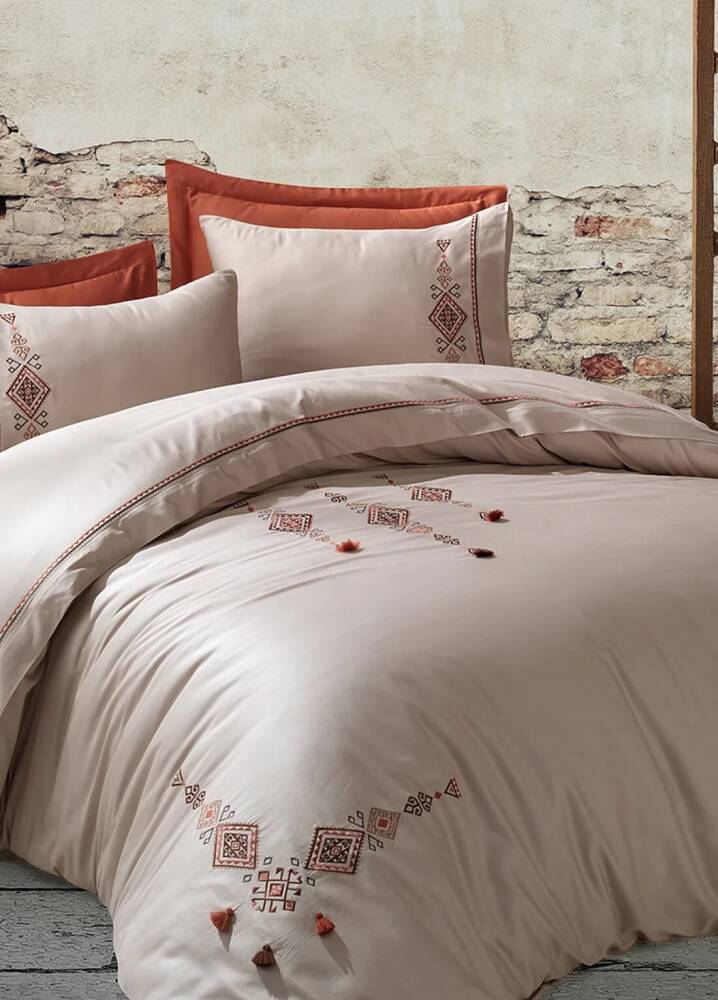 Tilbe %100 Pamuk Saten Nakışlı Çift Kişilik Nevresim Takımı - Bej-Kiremit
