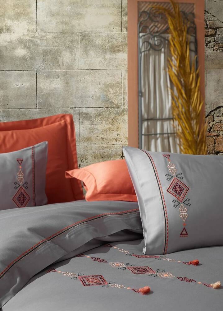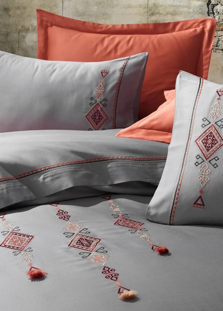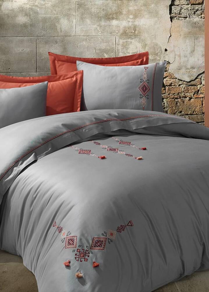 Tilbe %100 Pamuk Saten Nakışlı Çift Kişilik Nevresim Takımı - Gri-Kiremit